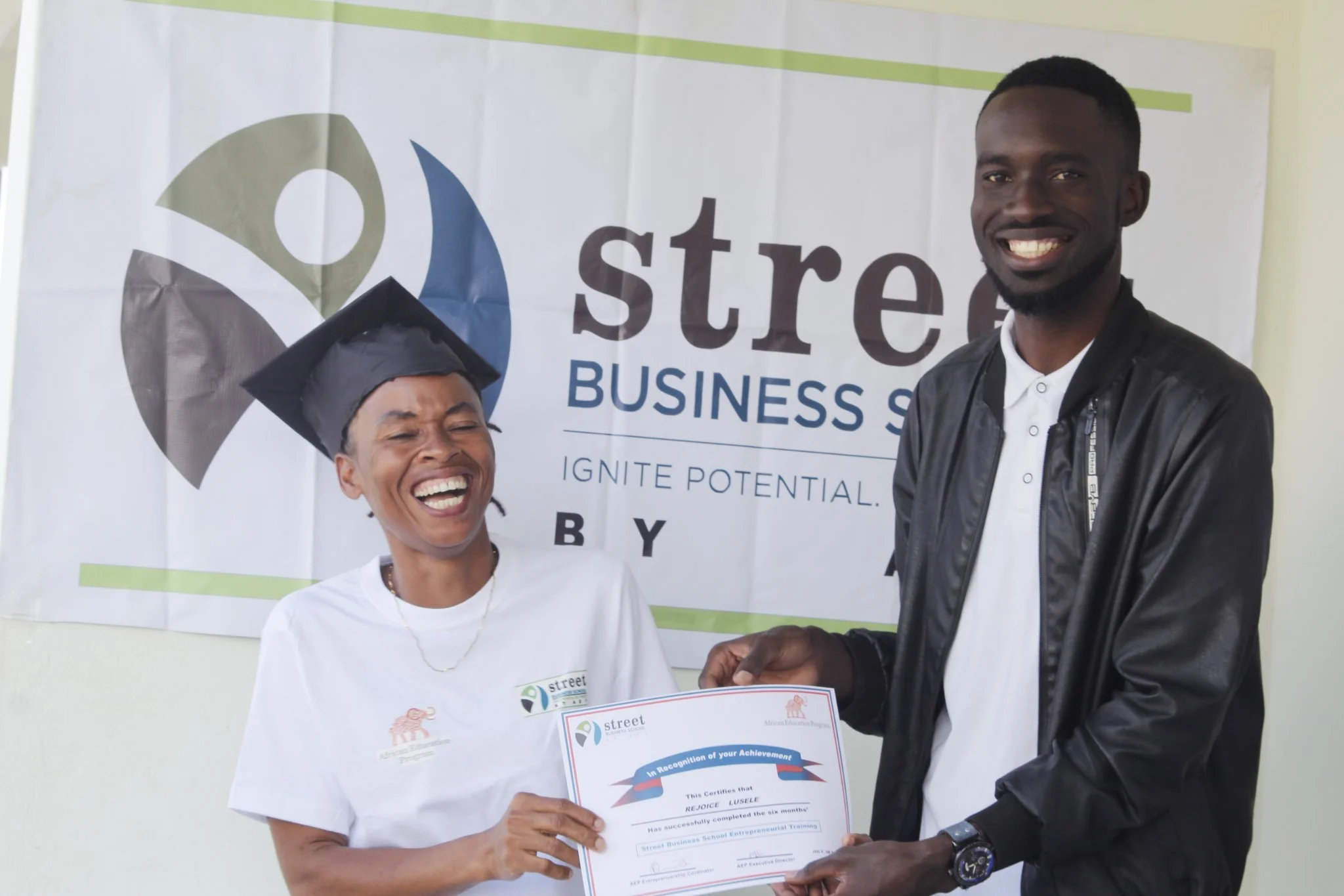 Right to left: Alumni and Entrepreneurship & Financial Literacy Program Manager, Benard Milanzi, hands a certificate to mother who recently graduated from the Adult Entrepreneurship Workshop.